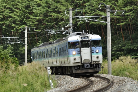 長野らしいきれいなアカマツ林の横を115系が下ってきます。