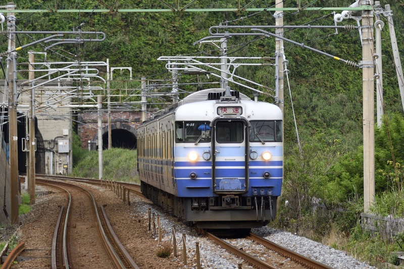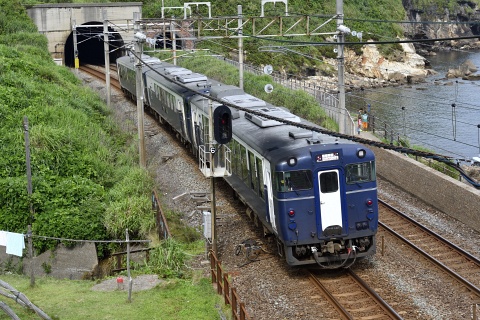 △ 信越本線 3373M 快速 新井発新潟行。クモハ115-1068(新ニイN35編成)、米山-笠島。[2017.07、新潟県柏崎市]