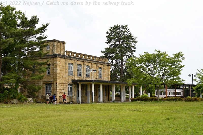 駅舎の裏側には、かつて線路が敷かれていた跡地が公園として残され、あちこちに高畠石でできた、かつての変電施設や倉庫などの建築物が保存されています。
