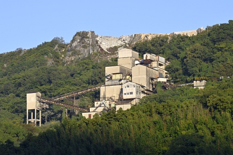 石灰石採掘で平らに削り取られた一ノ岳(上)と、ハイキングコースなどが整備されている二ノ岳と三ノ岳(下)。