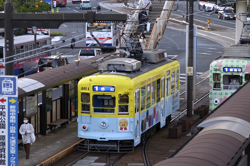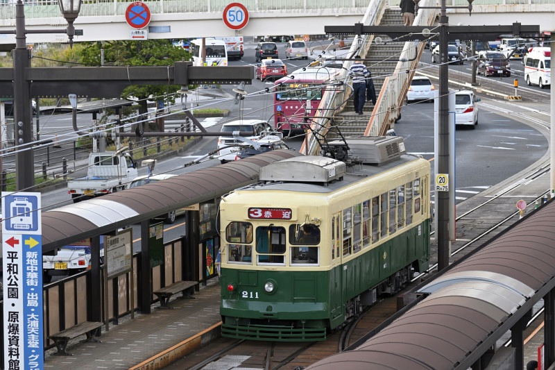長崎駅前の歩道橋に来ると、比較的古い車両が次々とやってきました。
