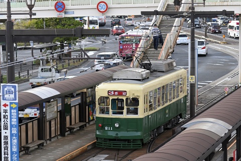 長崎電気軌道初のボギー車である201、202(昭和25)に続き増備された、昭和26年7月日立製作所の比較的古い車両がまだ現役です。