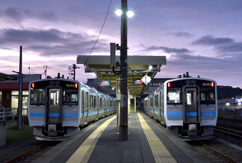 八戸線の列車はかつてのキハ40から新車のキハE131に変わり、キハ40の時代には苦労しながら登っていた侍浜への上り坂も、軽快に飛ばして久慈駅に着きました。 何度も見てきた久慈駅の夕景ですが、車両が変わるとまた違った印象になります。