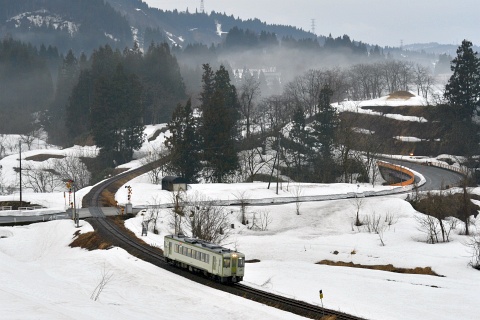 低く雲が垂れ込めるモノクロの世界を、上越線直通長岡行の下り一番列車が越後川口に向かいます。