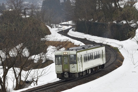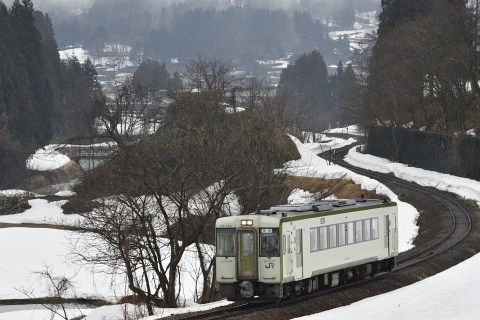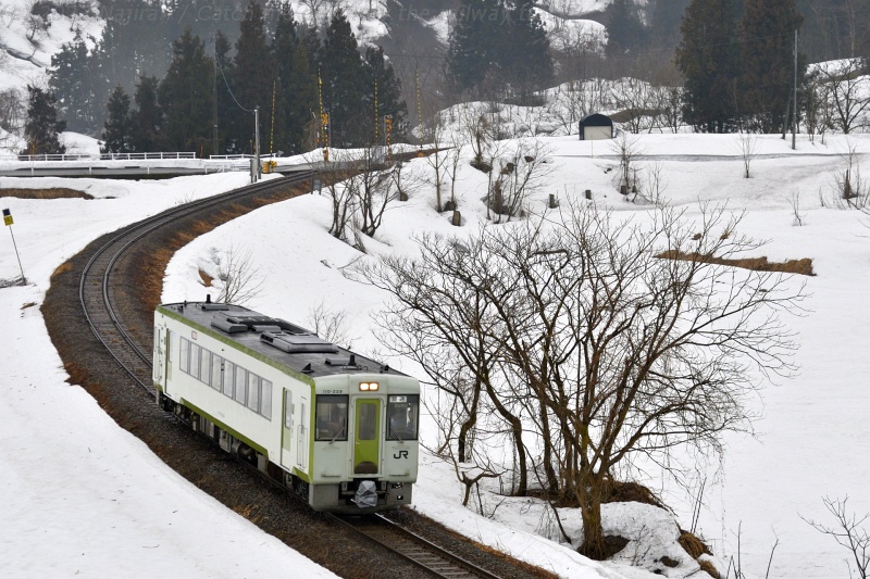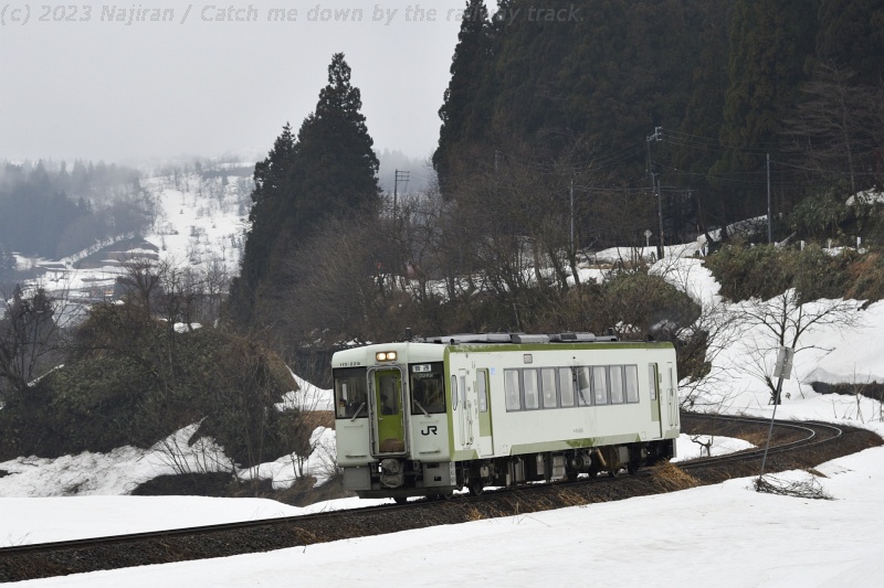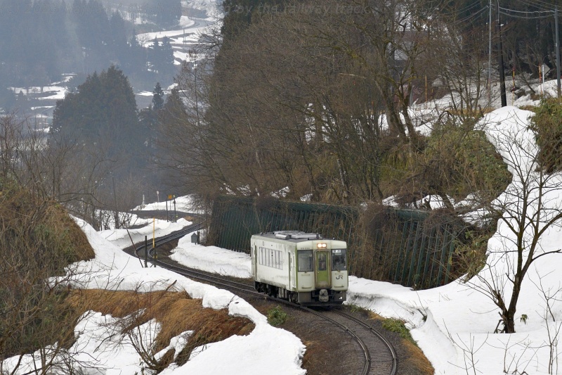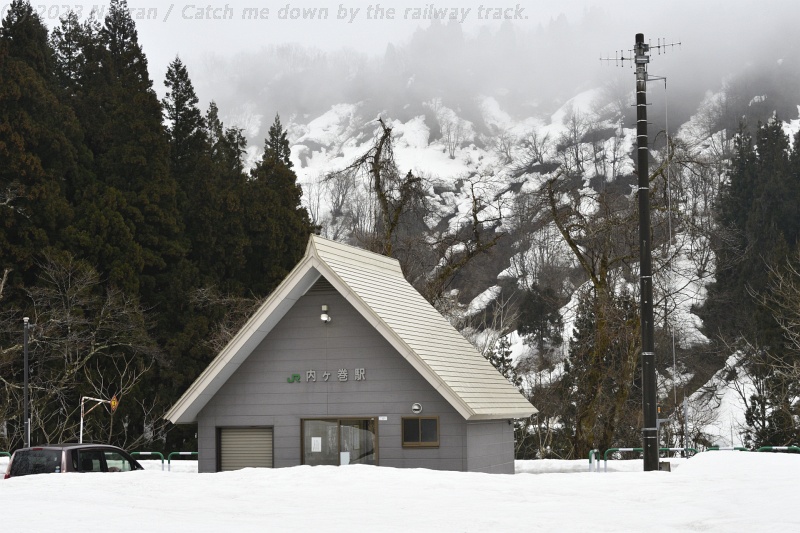 春浅い飯山線、2日目は内ケ巻周辺を訪ねました。 内ケ巻駅の発着時刻は、9:08発の十日町行上り列車の次は、12:55発の下り越後川口行と、4時間も間が空いています。 生憎の雨模様に撮影は9時までと決めて、朝の通勤列車を中心に越後川口寄りの曲線区間で撮影しました。