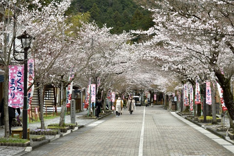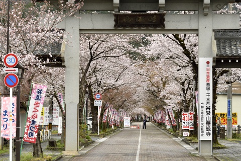 参道が始まる国道との交差点付近。 谷汲さくらまつり開催中の参道は、桜のトンネルのようです。