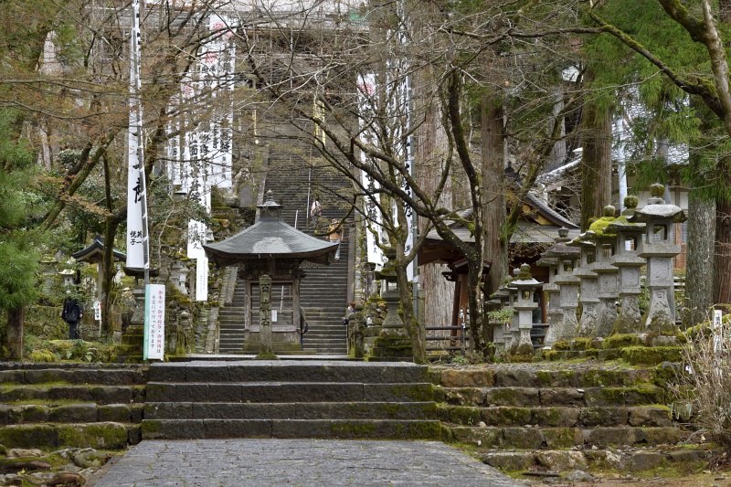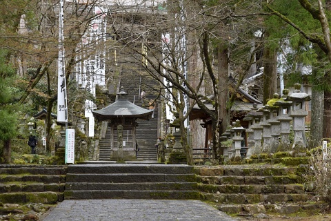 焼香場から本堂へ続く階段。 桜並木の山門前とはうって変わり、落ち着いた石畳の道が続きます。