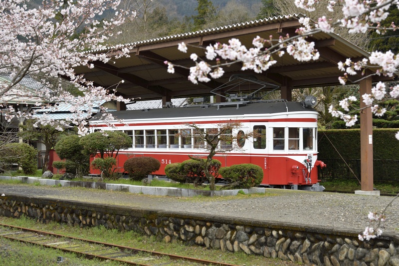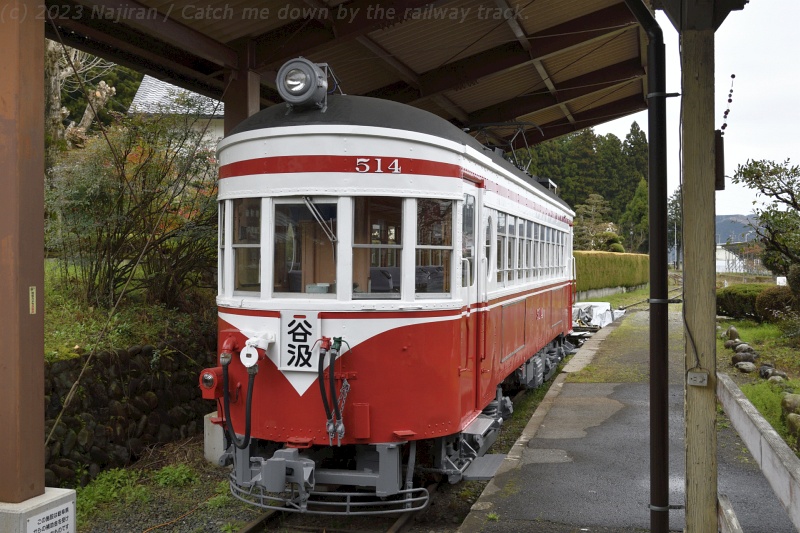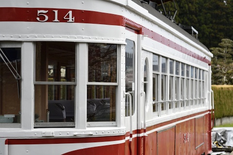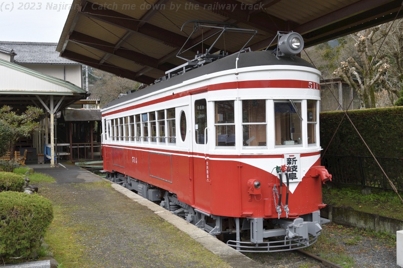 モ514は美濃電気軌道が1926年に製造したセミボ510形の一両で、半流線形の前面と丸い戸袋窓が特徴的な車両です。 名鉄になってからはモ510形と呼ばれています。 新製当初は笠松線(現在の名鉄岐阜~笠松間)で、その後美濃町線で運用され、岐阜市内線と揖斐線の直通運転が始まった1967年から揖斐線で運転されました。 モ770形やモ780形の新製・投入後もモ512~モ514の3両は廃車されずに時々運用につきましたが、2000年にモ512が廃車され旧美濃駅で保存されました。 モ513、モ514はその後もイベント等で運用されましたが、名鉄の600V区間が全廃となった2005年に廃車され、モ514が2006年から旧谷汲駅で保存されています。