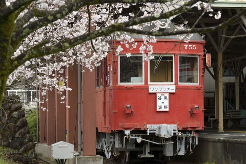 モ755は旧名古屋鉄道が1928年に製造したデセホ750形の一両で、かつて高山線への直通列車として下呂駅まで乗り入れるなど本線を中心に活躍しました。 名鉄の架線電圧の昇圧にともなって本線から瀬戸線、揖斐線へと移動し、最後は揖斐線・谷汲線で2001年まで活躍した車両です。 2002年から庭箱鉄道の活動の一環「谷汲駅(1067mm軌道事業)」として、旧谷汲駅に保存されています。