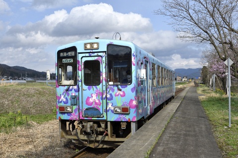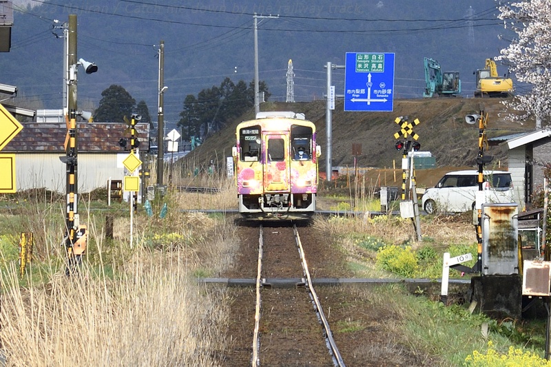 YR-886は、山形鉄道開業時の1998年に6両が製造されたうちの1両で、セミクロスシート、トイレ付、ワンマン運転仕様の車両です。 沿線の長井市の花「アヤメ」がラッピングされています。