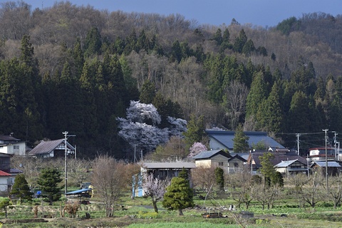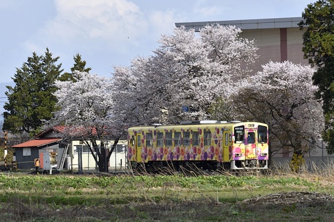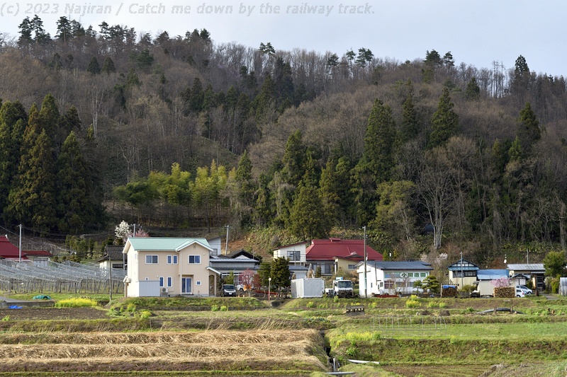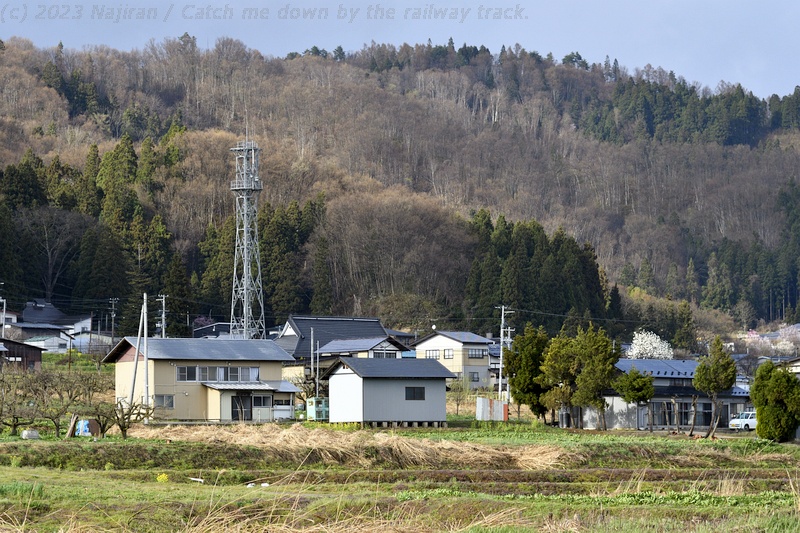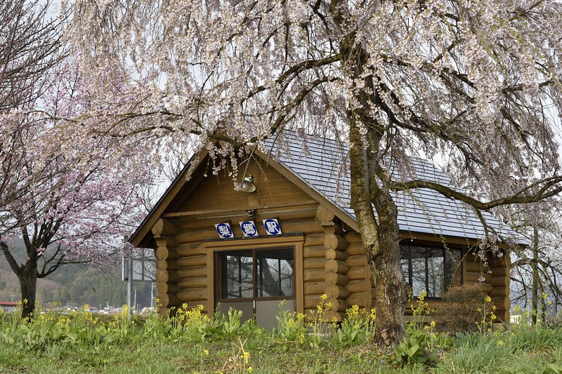 赤湯から4つ目の梨郷(りんごう)駅にやってきました。 梨郷駅は、長井線の前身となる長井軽便線が、1913年に赤湯から開業した時の終着駅です。 駅の南側は最上川が流れる水田地帯で、国道なども通っていて、周辺には市役所の出張所や小学校などがあります。 北側には標高300m前後の低い山を背負い、ちょうど陽だまりのような場所に集落がある長閑な地域です。 沿線の花マップに紹介された梨郷駅の桜に惹かれ、この駅で下車することにしました。