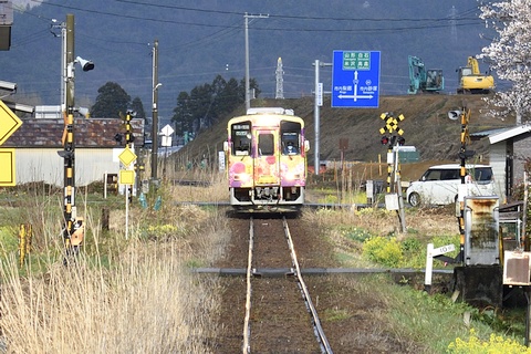 △ バナーは梨郷駅に停車中のフラワー長井線。