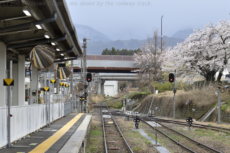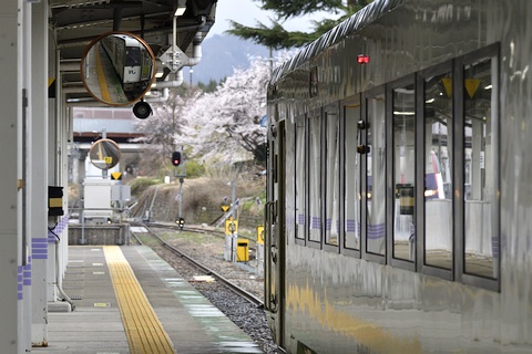 米沢駅の西側に、奥羽本線の開通に伴う工事や米坂線災禍などによる殉職者を祭る碑(1932年建立)があります。 その付近の桜が7分咲きで、米坂線のホームからよく見えていました。