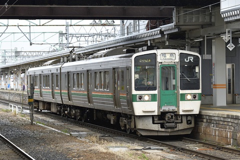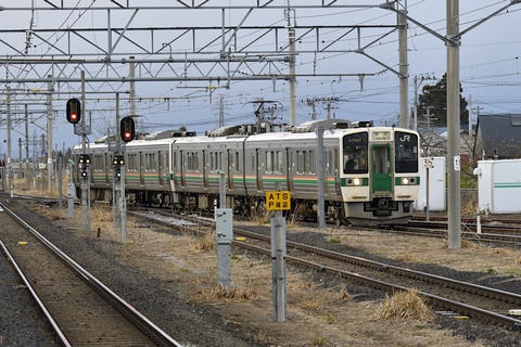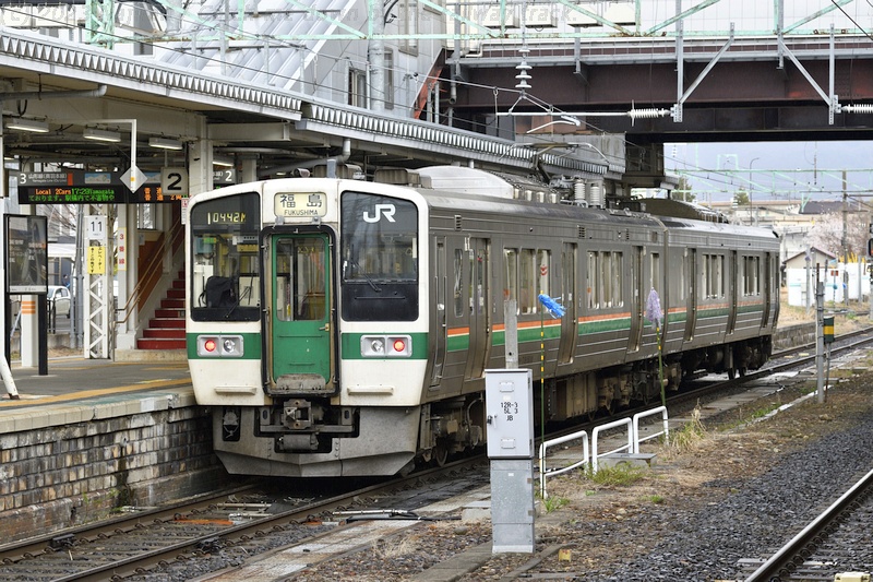山形新幹線開通で標準軌(1435mm)となった、福島-山形間の奥羽本線普通列車を務めている719系5000電車です。 1991年運用開始の比較的古い車両で、サイリスタ連続位相制御を採用しているため、最近のVVVF制御車とは走行音が異なります。 板谷峠を下る時の音は、なかなか魅力的に感じます。