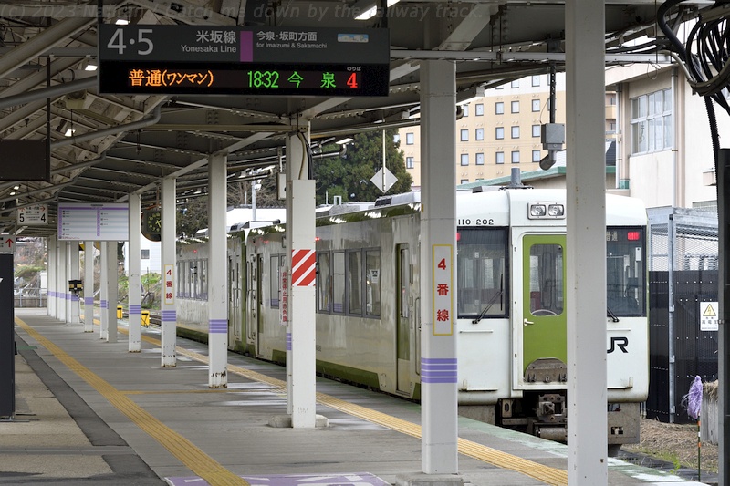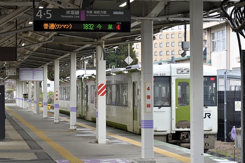 米沢駅4番線に到着した今泉発の列車です。 米坂線は、駅改札に直結する1番線を2段に切り欠いて作られた、4番線と5番線ホームから発着します。 この区画以外の軌間は、山形新幹線に合わせた1435mmです。