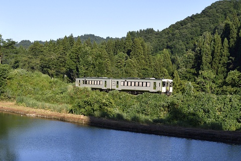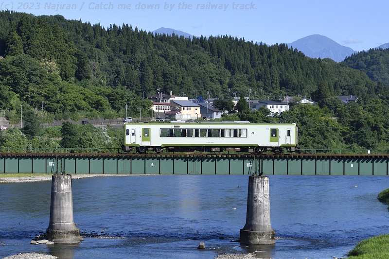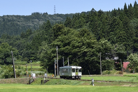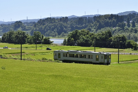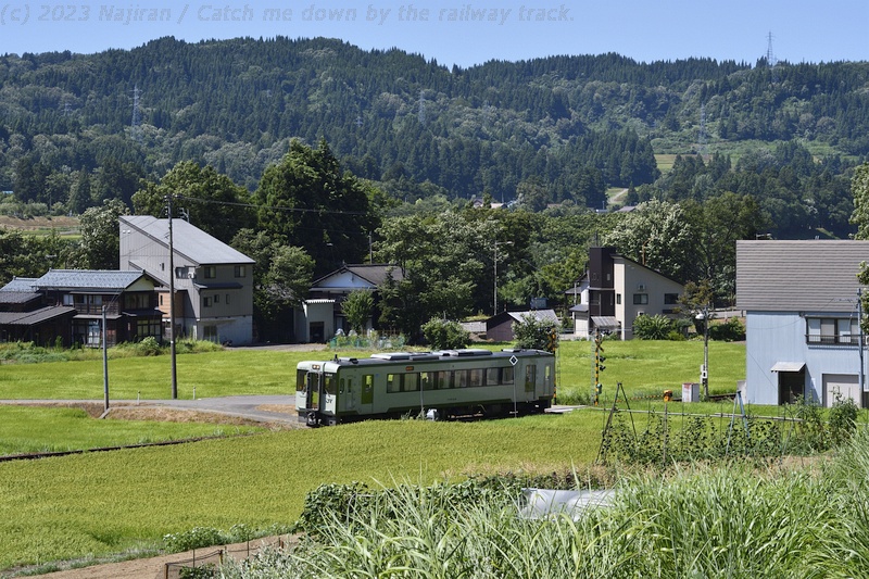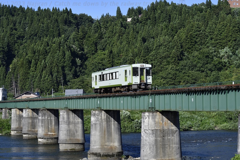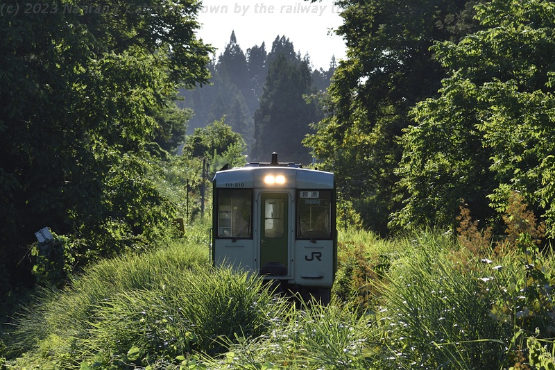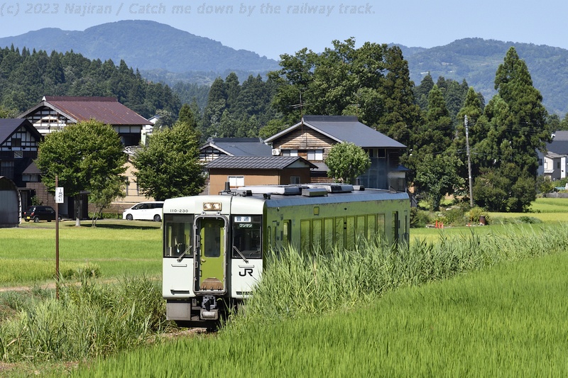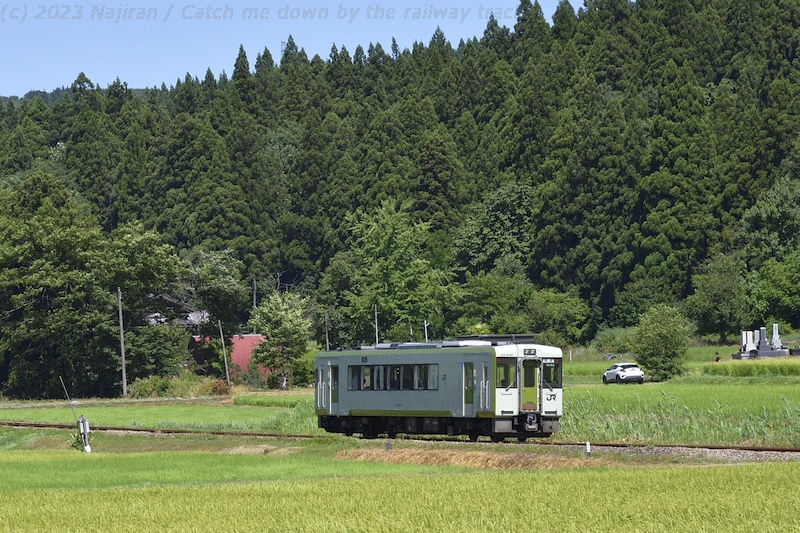 お盆前の休暇を利用して真夏の飯山線にキハ110系の気動車を訪ねました。 場所は十日町~越後川口間で、信濃川に沿って段丘上の水田地帯や魚沼の丘陵地帯を走ります。