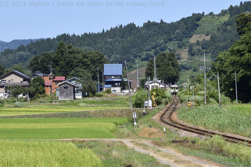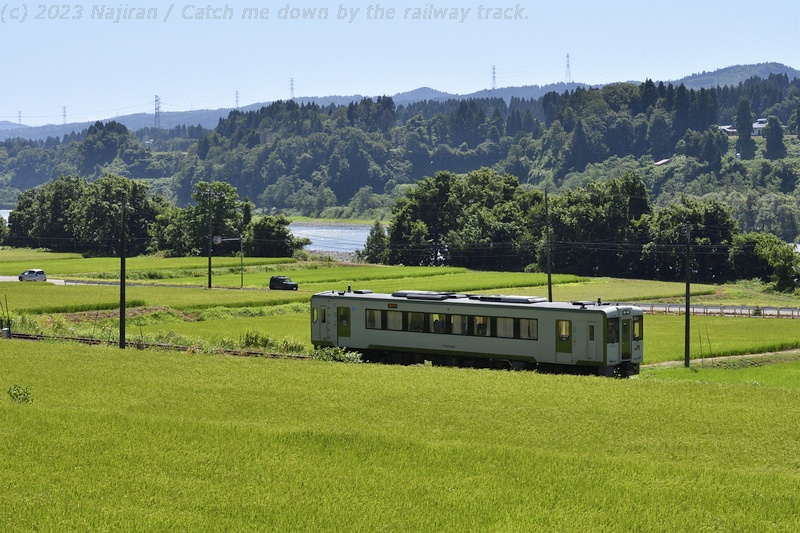 この辺り、信濃川の段丘に水田地帯が広がり、日中は単行気動車が行き来します。