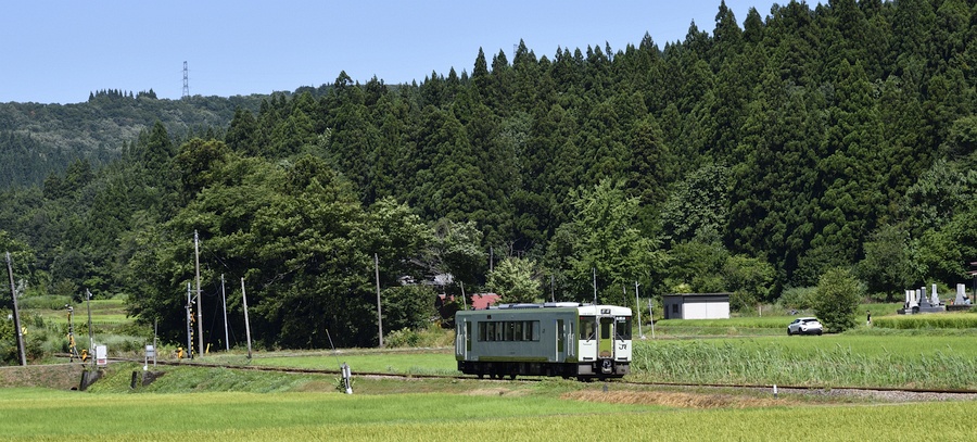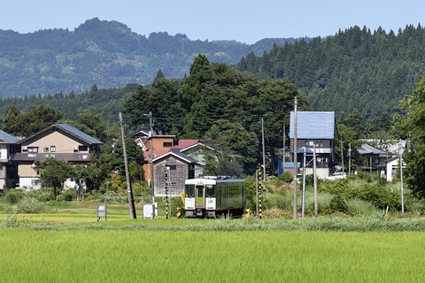 越後岩沢に近い水田を行くキハ110です。 これと言って特徴のない景色ですが、建物の様子などに雪深い魚沼を感じます。