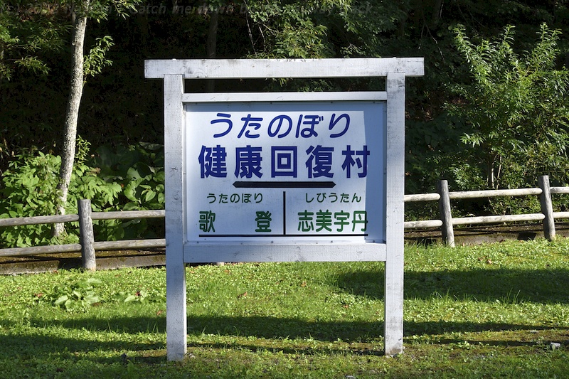 健康回復村は廃止された歌登町営軌道の支線、歌登-志美宇丹間にあり、保存車両の横には駅名標のような案内が立っていました。