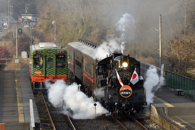 真岡鐡道 129レ 茂木行(モオカ14-9、左)と並んだ上りの SL新年号。 SL新年号は国旗と謹賀新年のヘッドマークを掲げての運行です。