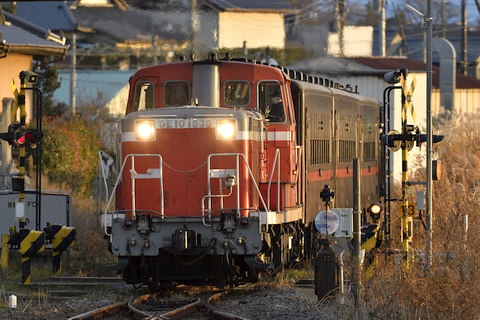 折本駅に進入する6103レ。 SLもおか(SL新年号) の運行日だけ設定がある、SLもおか を下館から真岡まで回送するための列車です。 回送を兼ねてはいますが普通列車として運行されるため、普通乗車券だけで乗車することができるお得な列車です。 DE101535 ディーゼル機関車を先頭に、50系客車、最後尾に C1266 蒸気機関車が連結された豪華編成です。