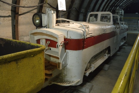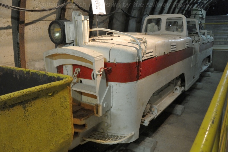 第5本坑道で人員及び資材の運搬に使用されている、軌間610mm、重さ12トンの東芝製の電気機関車 (直流500V、出力100kW、速度18km/h、牽引力2トン)です。他の水平坑道では蓄電池式機関車が使用されているそうです。