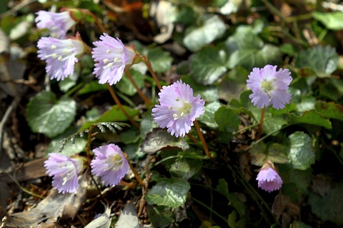 良く管理されたスギ林の林床でイワウチワが見ごろを迎えていました。