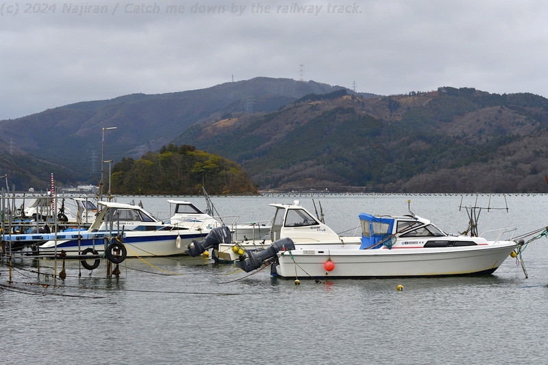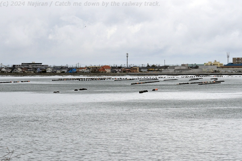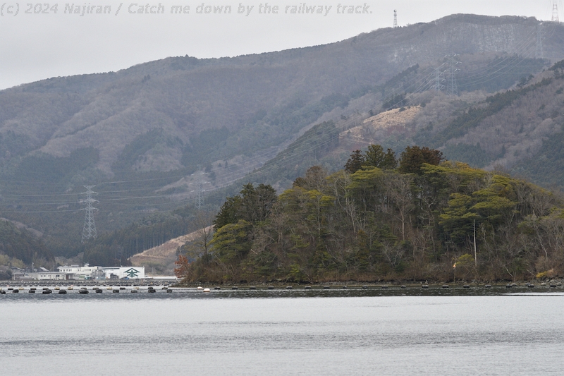 石巻から女川に向かう区間の石巻線は、風光明媚な万石浦(まんごくうら)に沿って走ります。 万石浦は渡波(わたのは)で石巻湾とつながる内海で、海苔や牡蠣の養殖が盛んな所です。 午後からみぞれが降るあいにくの空模様でしたが、途中の沢田駅で下車し、万石浦沿いの国道を浦宿駅方面に歩きました。 万石浦も、時折みぞれにかすみます。