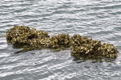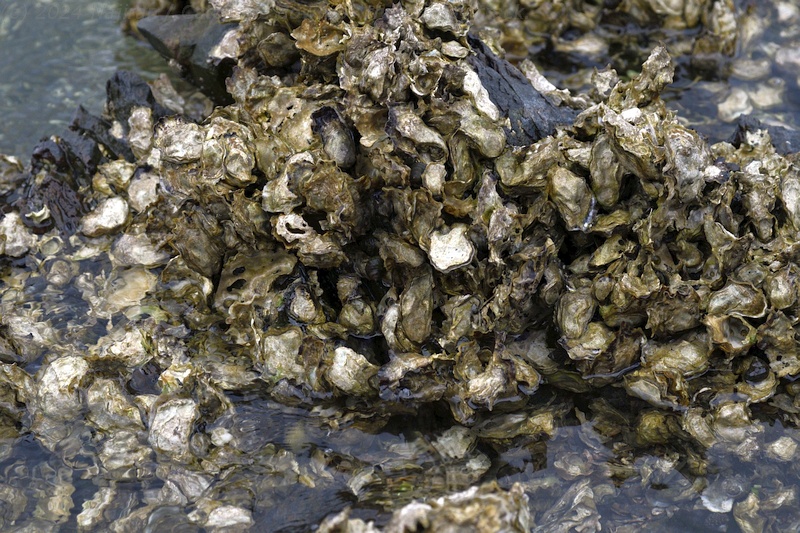 次の列車が来るまでの小一時間、万石浦の波打ち際に降りて牡蠣礁を眺めたりして過ごしました。