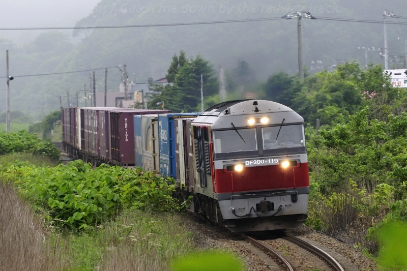 この季節の噴火湾沿いは天気が良ければとても気持ちの良いところで、朝日を浴びて海岸沿いを蛇行しながら札幌を目指す列車を広大な景色とともに俯瞰できます。しかし、当日は海からの霧がひどく、遠望が効かないばかりか光量もとても少なく、撮影条件は必ずしも良くなかったです。そんな状況だったので列車を中心に撮影することに決め、予め調べておいた撮影地の中から比較的人が少なそうな場所を選び、大岸駅で下車しました。