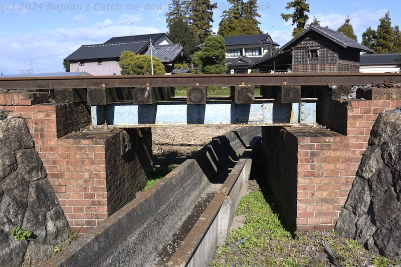 今はU字溝を跨ぐだけの水さな鉄橋ですが、イギリス積みレンガの丁寧な作りが目を引きます。 こんな短い鉄製の橋桁にも立派な銘板が付いていました。 しかし、銘板自体の腐植と風化した厚塗りの塗装のため大変読みにくい状態でした。 漢字の "川"、アルファベットの "KAWASAKI" と、"明治四拾?年" の文字がかろうじて見えます。 下館~真岡間の開業は1912(明治45)年なので、おそらくその時からの施設でしょう。 "川" に続く文字は川﨑造船所でしょうか。