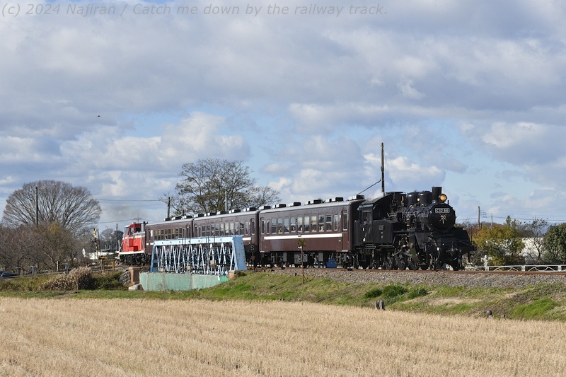 五行川橋梁を渡る茂木行のSLもおか。最後尾にDE101535を連結してやってきました。