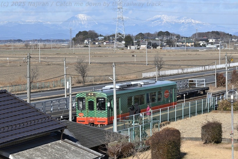 駅周辺をロケハンしながら列車を待つこと20分くらい。 駅に隣接した下館折本郵便局で追加の年賀状を投函したりして過ごし、駅を見下ろす日当たりのよい高台に落ち着きました。 今年最初の一枚は、折本駅に停車中のモオカ14 2、下館行です。 列車の向こうには、雪化粧した日光連山が並びます。