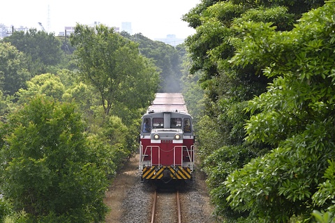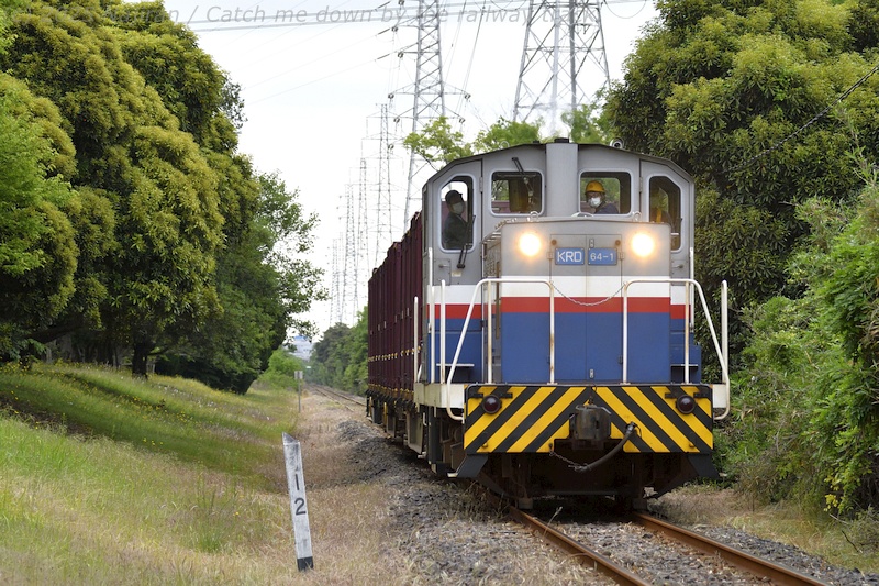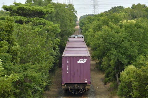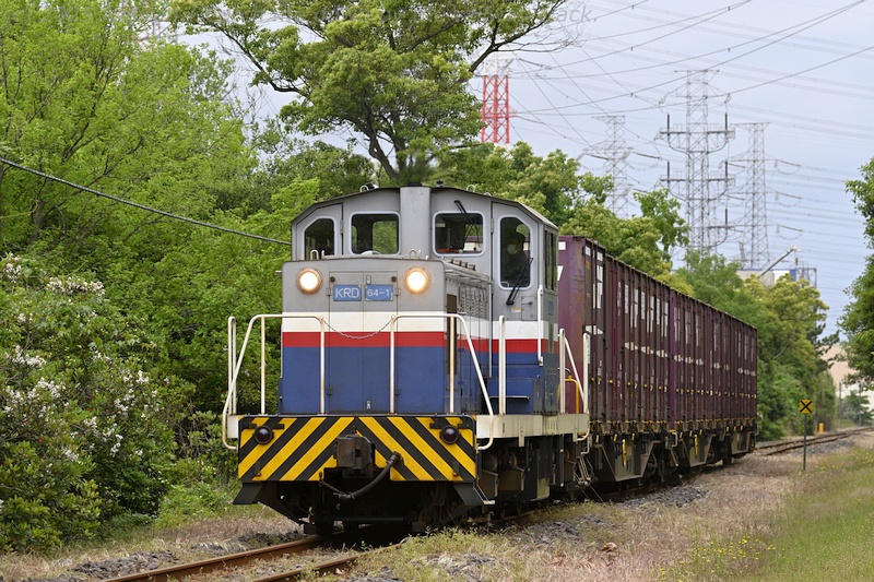 神之池緑地公園のパターゴルフ場の近くに、道路沿いの駐車場と公園を結ぶ歩道橋が線路を跨ぐように整備されていて、その上から臨港線を望むことができます。 この日はKRD形機関車のうち唯一現役を続ける KRD5 が神栖-奥野谷浜間の列車に充当されました。 KRD形は国鉄のDD13を模して、鹿島臨海鉄道の開業時から5両が新製されています。 神之池緑地公園の緑地に沿ってまっすぐに引かれた臨港線を、数両のコンテナ車を従えて神栖に向かいます。
