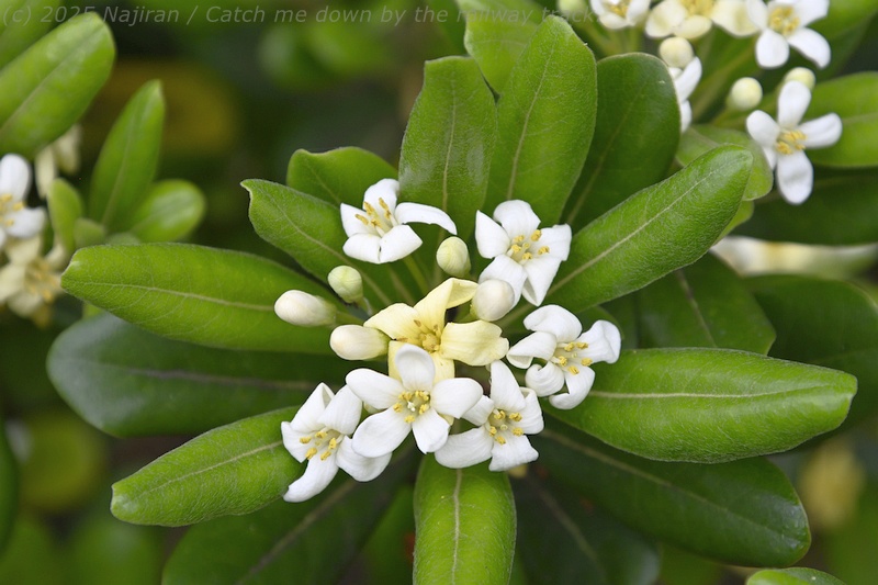 テニスコートから神栖に寄った踏切で、奥野谷浜で折り返す上り列車を待ちました。 神之池緑地公園の造成された緑地では、シラカシやマテバシイの下に植えられたトベラがきれいに咲いていました。