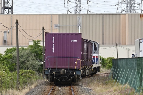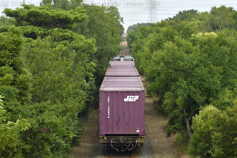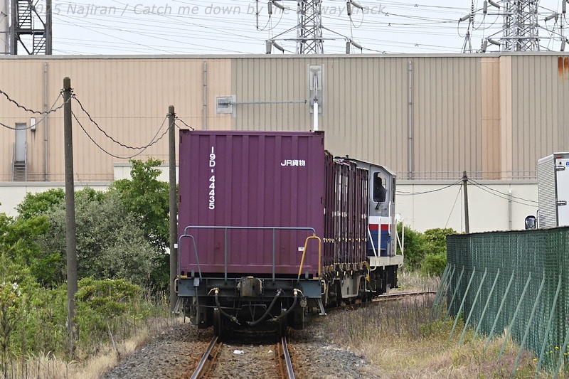 鹿島臨港線の朝一番の神栖行貨物列車 95レは、不定期に奥野谷浜まで運転されます。 鹿島臨港線は神栖駅から農業調整池として整備された神之池に沿って南東に進み、知手から北東に、さらに北西へと工業団地を囲むように向きを変えます。 終点は、JSR工場への専用線が分岐する手前辺りでしょうか。 線路は道路を越えた先の三菱ケミカル茨城事業所の北東側まで伸びていますが、途中に車止めがあり踏切から先の線路は草に覆われています。 (地名・名称は地理院地図より2025年1月取得)