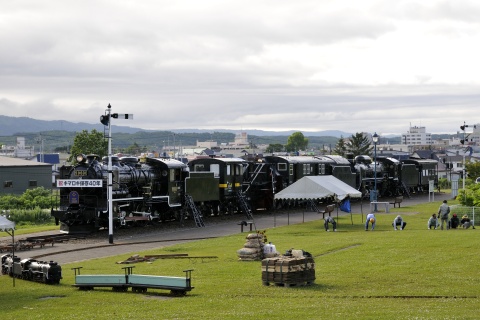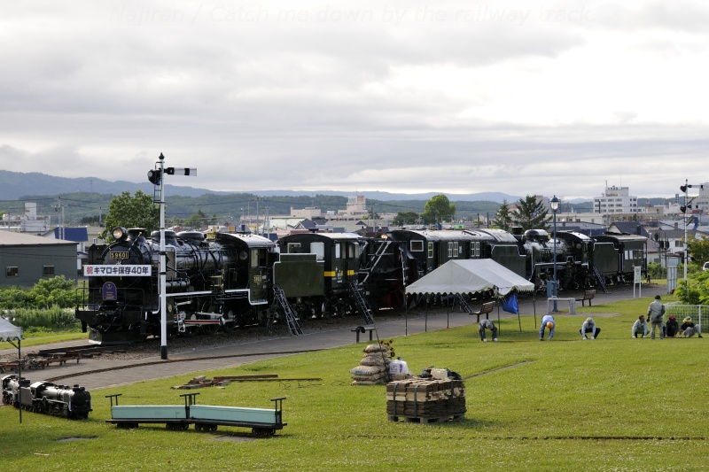 2015年6月26日(金)~28日(日)に名寄市の北国博物館で、キマロキ保存40年・深名線廃線20年を記念した記念展が開催されました。実は今年の冬、名寄駅から歩いてキマロキを見に行ったのですが、青シートでしっかり保護されていて車両は見ることができませんでした。再訪となりましたが、先頭の機関車59601には大きな「祝キマロキ保存40年」のボードが掲示されていて...すっきりした写真を撮りに何もない夏季にもう一度行かなくてはいけなくなりました(笑)。さすがに博物館で保存展示されているだけあって、状態は大変良好です。