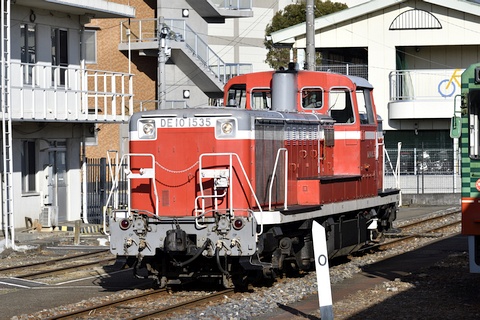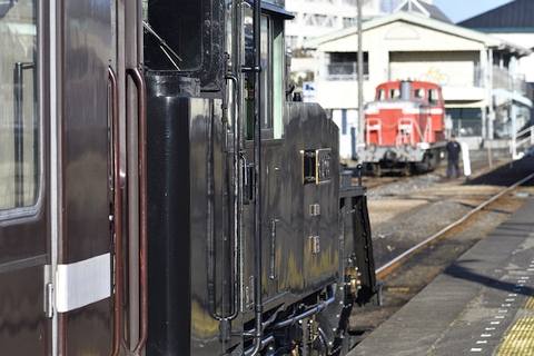 この日は真岡駅前で一泊することに決めて、SLもおかの回送を兼ねた6103列車に乗ってみることにしました。 6103レはSLもおか運転日だけ運行される、ディーゼル機関車牽引の客車列車です。 下館駅には機廻し設備がないため、朝の真岡-下館回送と夕方の下館-真岡はディーゼル機関車の助けを借りて運行します。 6103レは、SLもおかの回送を兼ねた夕方の下館発真岡行列車で、DE10 1535+50系客車+C12 66 の編成で運転されます。