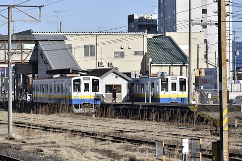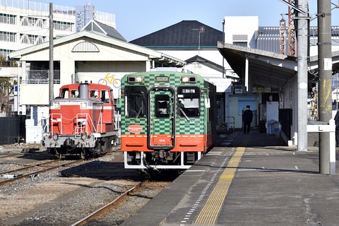 下館駅に乗り入れる関東鉄道は、下館駅南口に近い島式ホームの5・6番線を使用します。 SLもおかを待つ間にキハ5022が到着し、島式ホームの両側に列車が並びました。