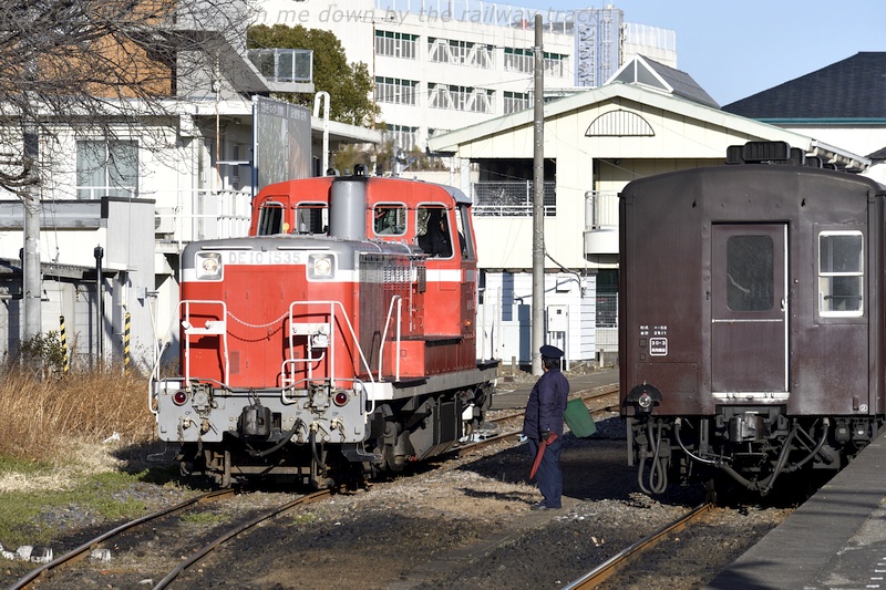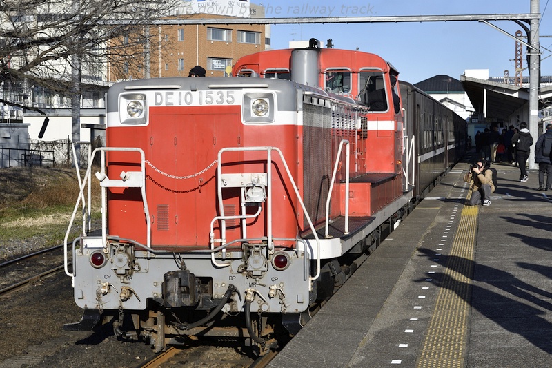 留置線で待機していたDE10 1535は、SLもおか到着後に1番線に転線し、列車の真岡側に連結されます。