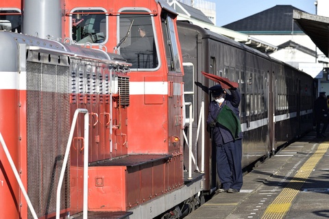 SLもおかが到着する下館駅1番線は、真岡鐡道が発着に使用する切欠きホームですが、機廻しができる構造にはなっていません。 そのため、下館駅到着後は列車の真岡側にディーゼル機関車を連結して、車庫のある真岡まで牽引させます。 この列車が6103レで、SLもおか運転日だけ運行される下館発真岡行の普通列車(途中の停車駅は折本、久下田)です。