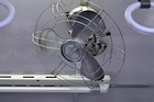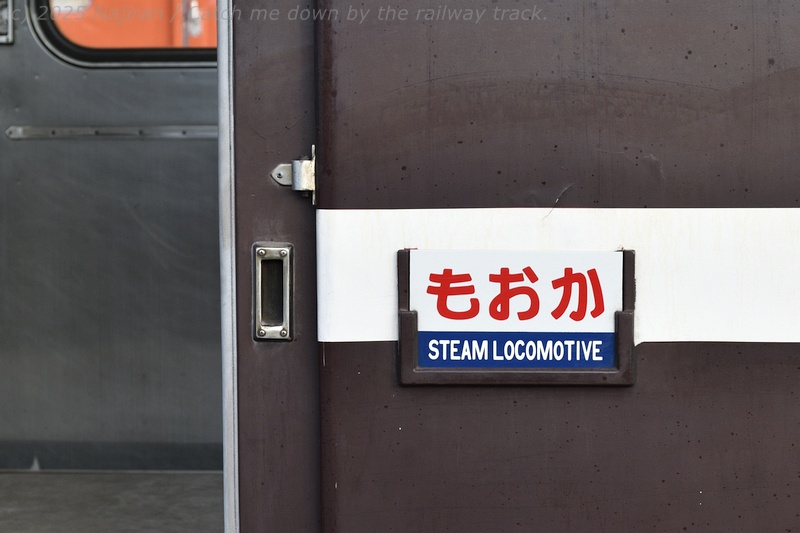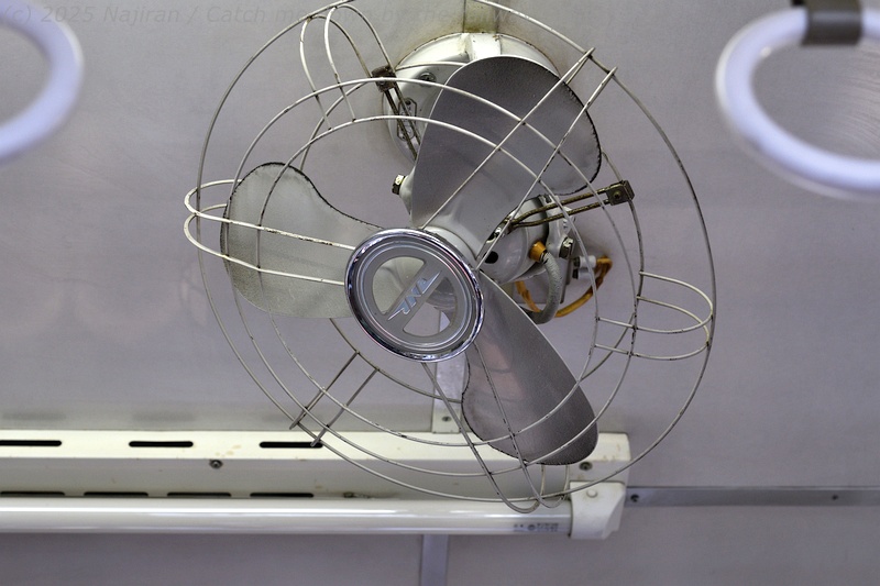 客車は3両連結されていますが、この列車で乗車できるのは下館寄りの3号車(オハフ50 33)だけです。 この日の車内は思っていたより混んでいて、ドアに近いロングシートの空席に座りました。 車両の座席数(67)と同じくらいの人が乗車していたと思います。 乗客が多かったので車内の写真は撮らずに、真岡まで汽笛の音を聞きながら景色を眺めて過ごしました。 1枚だけ撮ったのは天井に取り付けられた扇風機の写真です。 50系客車には冷房設備はなく、往時のままのJNRのマークが入った扇風機が取り付けられています。