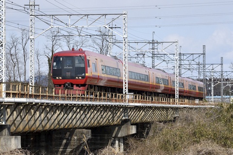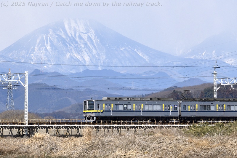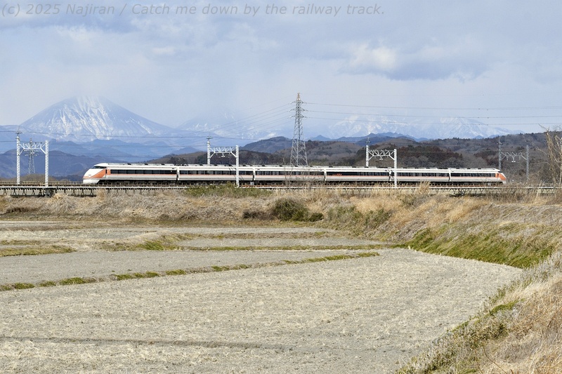 JR日光線の後は、東武日光線に向かいました。 場所は、栃木市(東武金崎駅)と鹿沼市(楡木駅)の間にある思川橋梁です。 思川の右岸堤防から線路越しに日光連山が望める所ですが、だんだん雲が沸いて山々が見えなくなってきたので、橋梁を渡る写真を何枚か撮って撮影を終了しました。