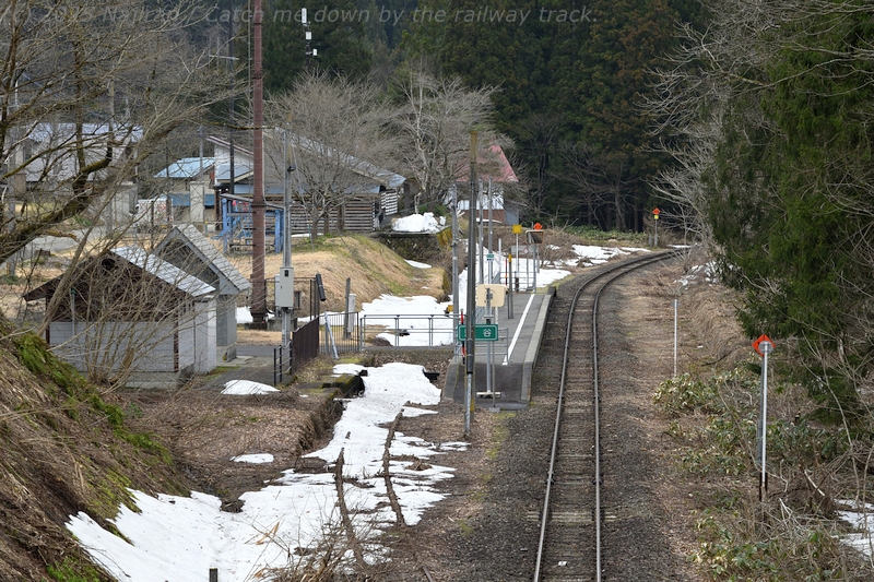 滝谷川橋梁側から見た滝谷駅で、写真の向こう側が柳津方面になります。 こちらから見ると、旧上り線用のホーム(写真左側)がよく分かります。