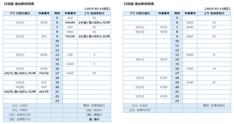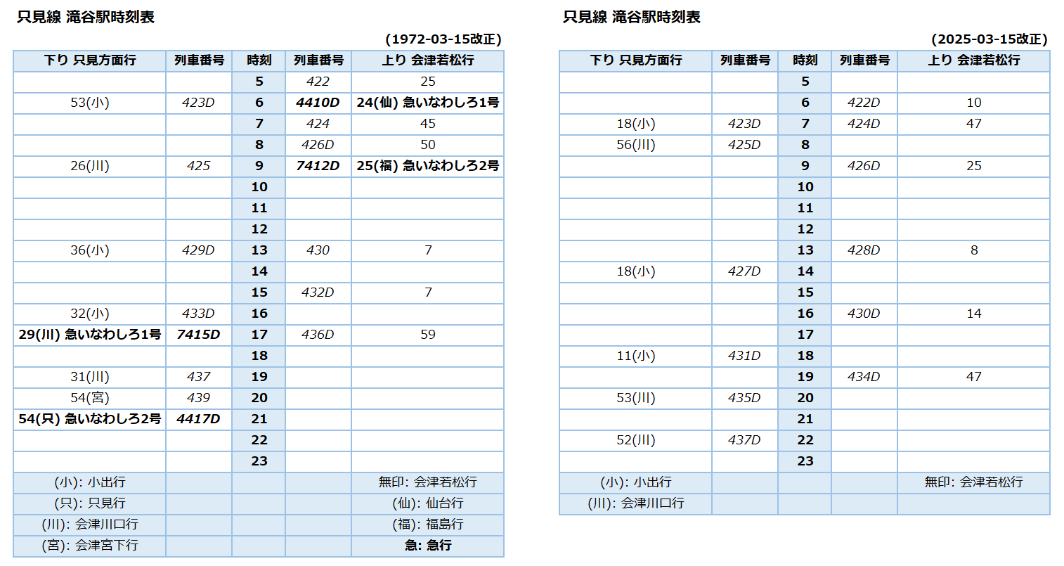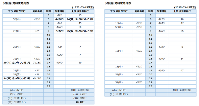 只見線が全通したのは1971年8月(ダイヤ改正前年の夏)なので、左側の1972年3月改正の時刻表には直通後に設定された1日3本の小出行が載っています。 普通列車の本数は1972年も2025年も6本づつで変わりませんが、1972年の方が全体に朝方に寄った運行になっていて、上り最終列車は何と17:59発という早寝早起きダイヤです。 1972年当時、蒸気機関車がけん引する客車列車(上り・下り3本づつ)が残っていて、その内2本は会津宮下と会津川口で夜間滞泊していたようです。 なお、只見線の客車列車は1972年10月に全て気動車化されていて、全線開通や客車列車の廃止など、只見線にとって大きな出来事が続いた時期でした。