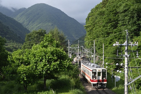 △ 野岩鉄道会津鬼怒川線 314レ 区間快速鬼怒川温泉行。モハ61103+クハ62103(後追い)、会津山村道場-七が岳登山口。[2025-06、福島県南会津郡南会津町]