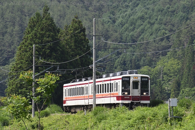 △ 野岩鉄道会津鬼怒川線 805レ 区間快速会津田島行。クハ62103+モハ61103、会津高原尾瀬口-七が岳登山口。[2025-06、福島県南会津郡南会津町]