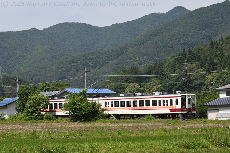 △ 野岩鉄道会津鬼怒川線 804レ 新藤原行。モハ61103+クハ62103(後追い)、上三依塩原温泉口。[2025-06、栃木県日光市上三依]