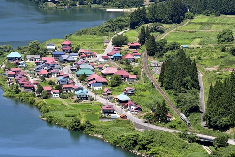 静かに水を湛えた只見川と赤い屋根が印象的な金山村大志集落を、開拓農地が広がる尻吹峠から俯瞰しました。 春先に訪れたときは雪で通行止めだった尻吹峠からの景色が見たくて再訪です。 大志集落はすっかり夏の装いに変わりましたが、キハ40だった頃の写真と比べると、周辺の水田が休耕になったりしていて少し残念でした。
