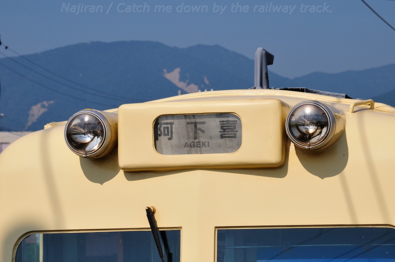 阿下喜駅は員弁(いなべ)川の左岸にあり、駅のホームからは藤原岳や竜ヶ岳など、鈴鹿の山々が見渡せます。中でも石灰石の採石場やセメント工場が有る藤原岳の白い山肌は威容を誇っています。川の対岸の少し高い位置には同じ三岐鉄道の三岐線(軌間1067mm, 3ft 6in)が通り、旅客輸送のほか、東藤原駅の近くにある太平洋セメント藤原工場で生産されるセメントを運んでいます。一方、こちら側の北勢線は軌間762mm(2ft 6in)のナローゲージの鉄道で、3~4両編成の小さい電車が旅客輸送を行っています。